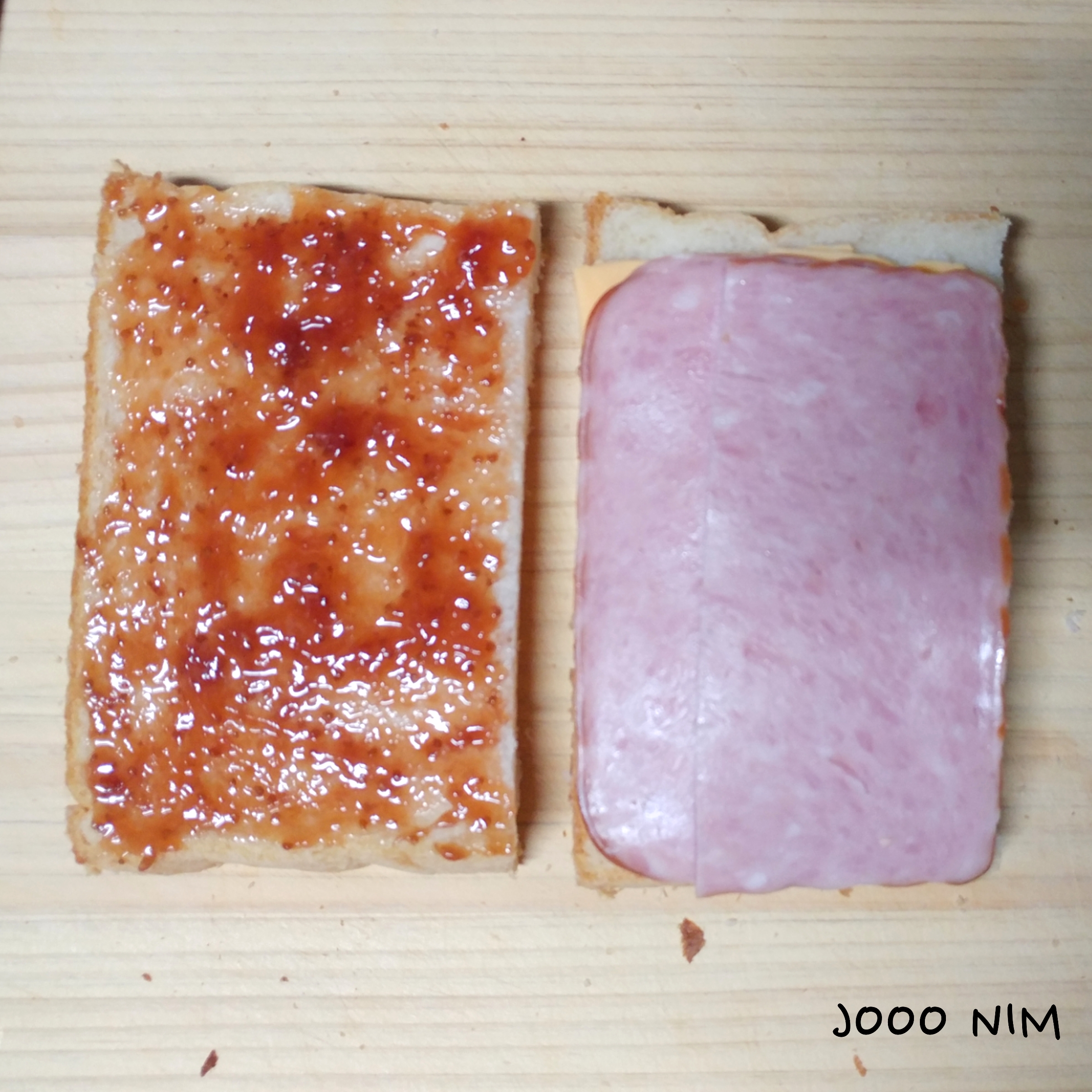 빵 하나에는 딸기쨈을 바르고, 다른 하나에는 치즈와 햄을 올린다.