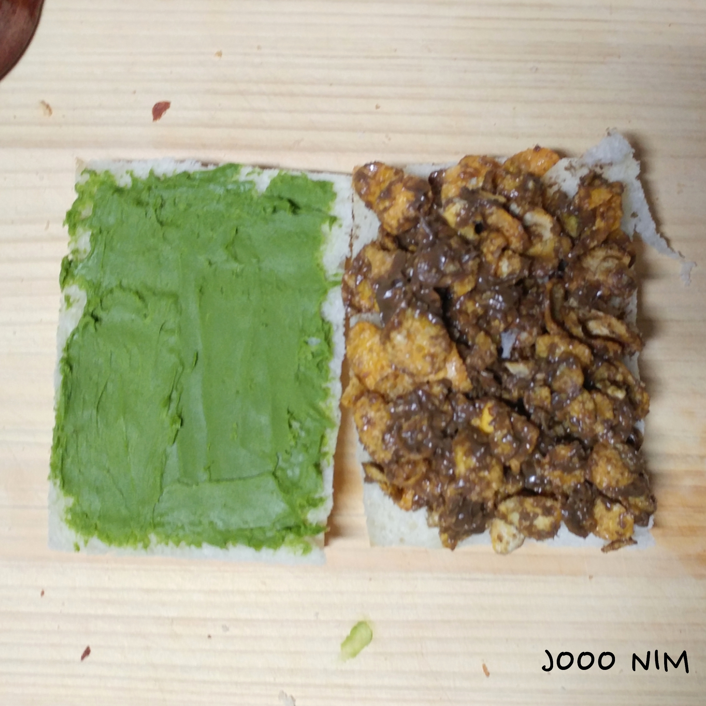 식빵 하나에는 녹차스프레드, 하나는 버무린 시리얼을 올린다.