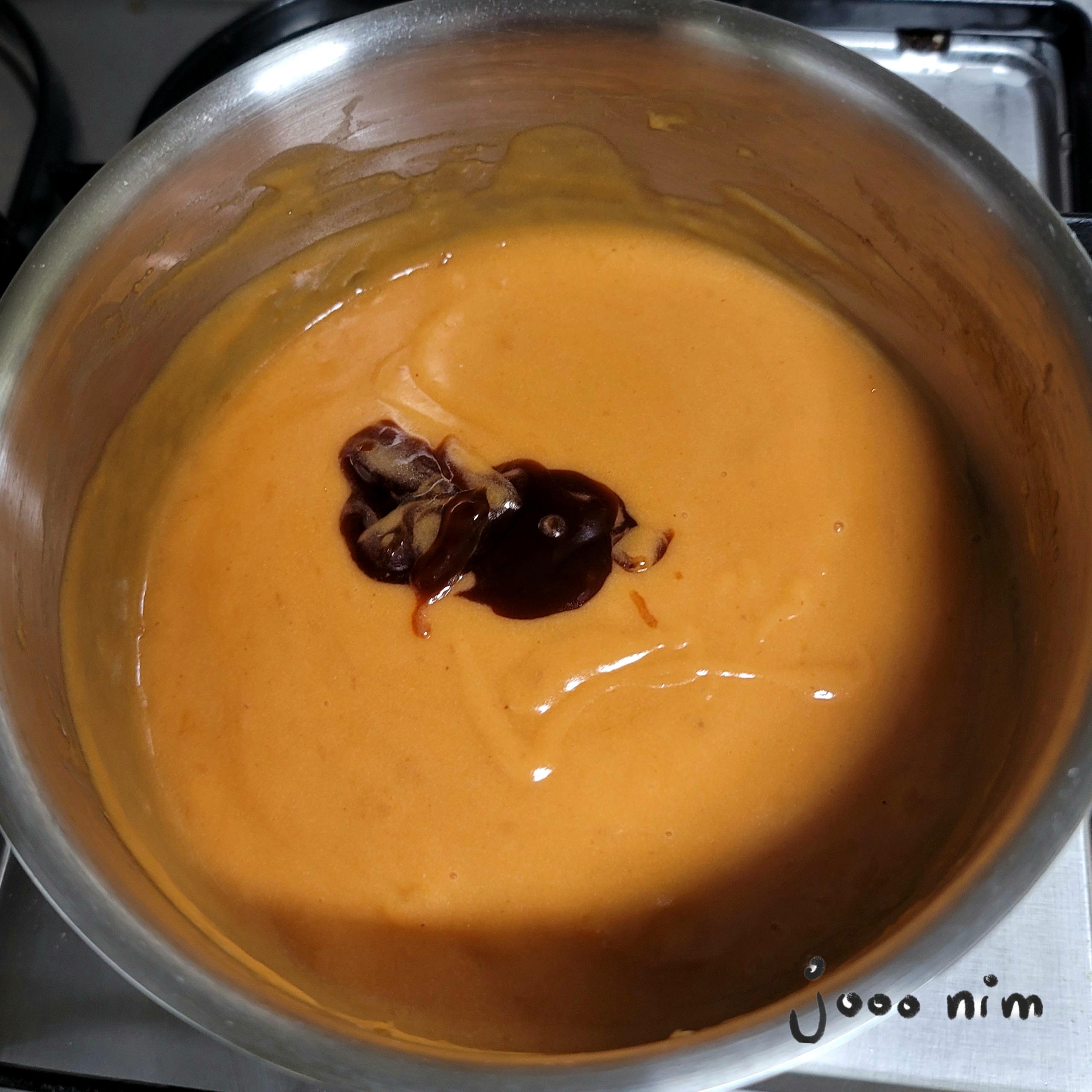 우유넣고 잘 저으면서 끓임.