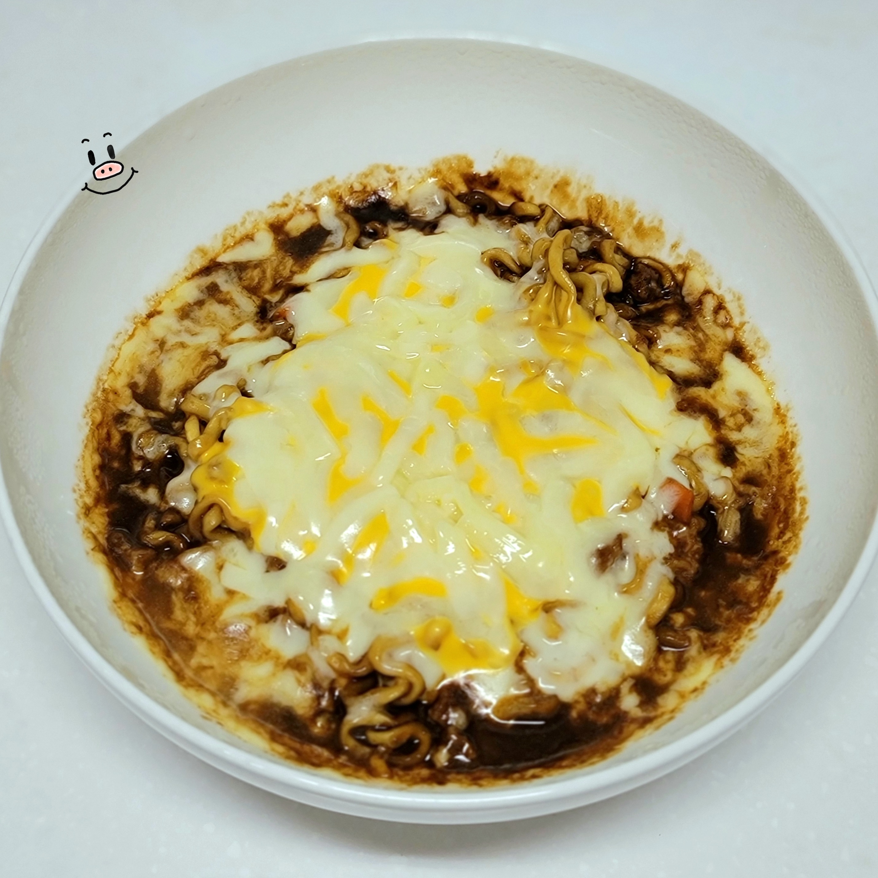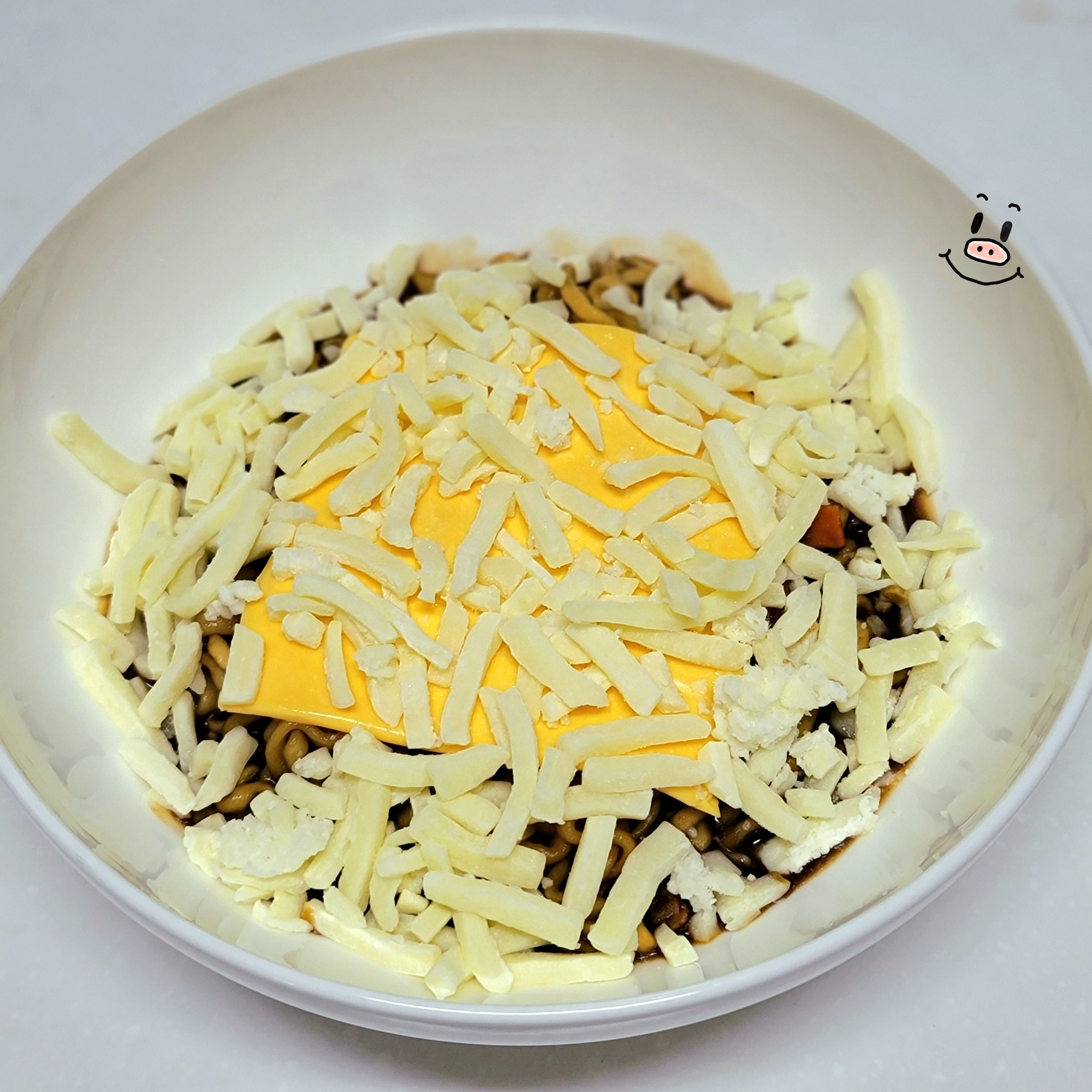 짜파게티라면 1봉, 물 350~400ml, 슬라이스치즈 1장, 피자치즈 1주먹, 계란 1개
